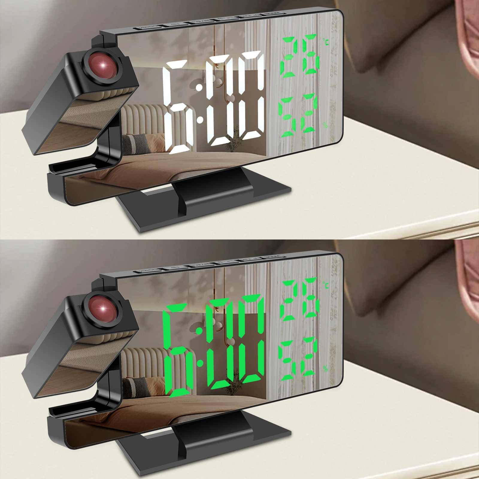 [Mirror Projection Clock] This projection alarm clock features 1 independent alarm clock, you can reasonably plan your time. Mirror surface design, the projection alarm clock can be used as a daily makeup mirror, check the time while make up, no need to worry about being late for appointments. And it has memory function: no need to reset the settings when reconnecting after power failure.